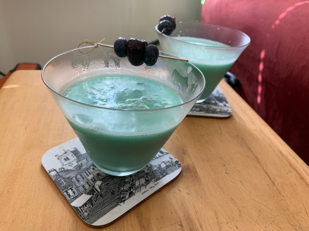 - Garnish with a cocktail pick of 2 Blueberries and a Maraschino Cherry🍒