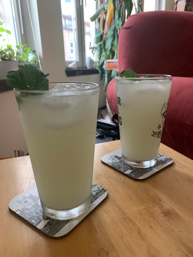 - Strain through a sieve the Gin/Basil mixture; half of the amount into each Pint Glass.