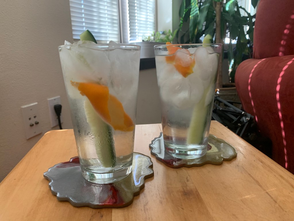 - Garnish with an Orangeš Twist and Cucumber Spear.